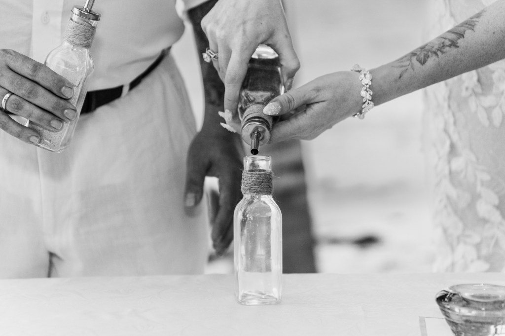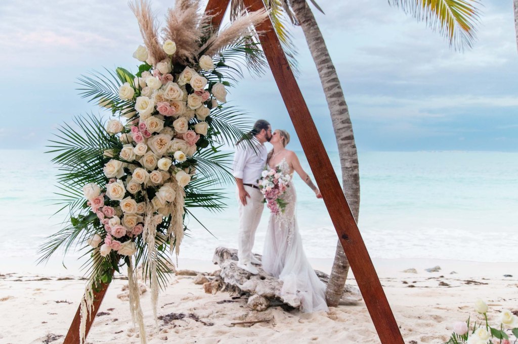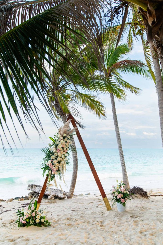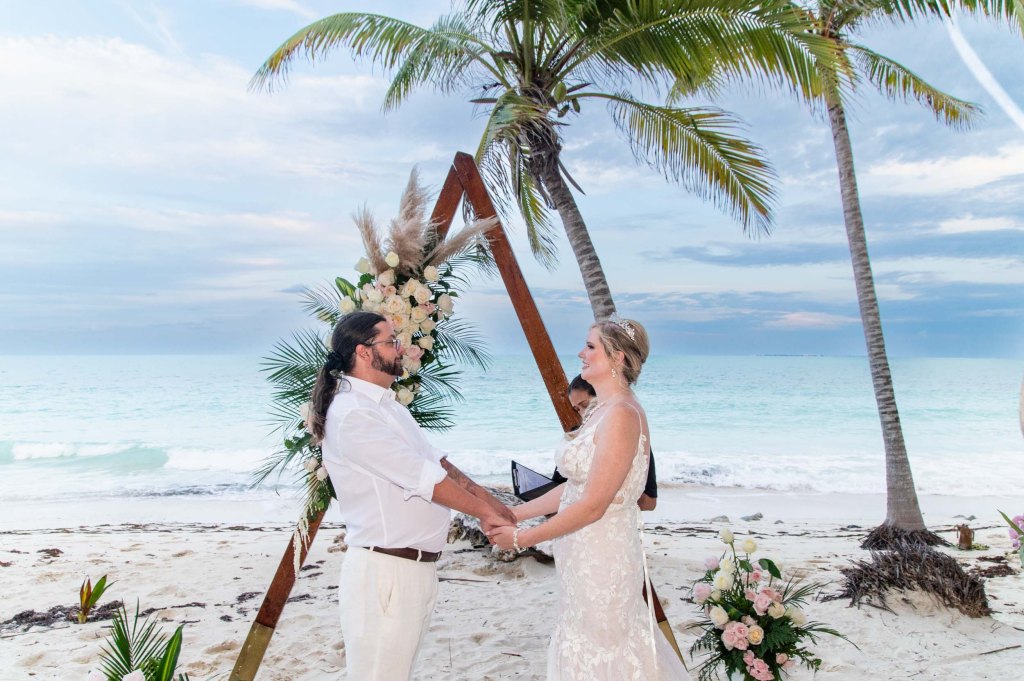 The beach was nearly silent as the couple walked hand in hand toward the shoreline. Barefoot on the sand, with a gentle warm breeze swirling around them, L and V took their place beneath a soft, minimal arch decorated with tropical touches.